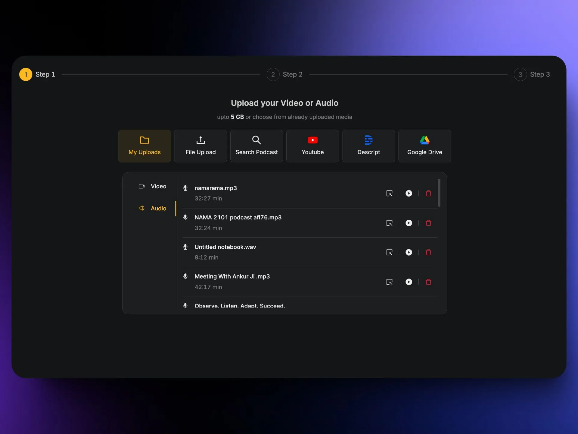 - Upload your Notebook LM audio file to Recast Studio.