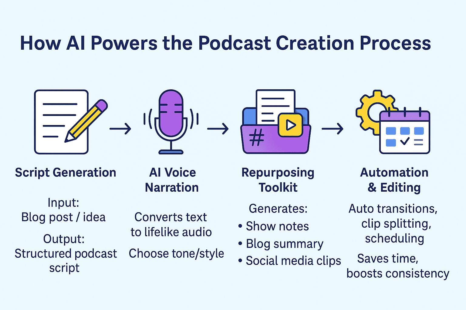 If you’re producing podcasts for clients or a content network, doing everything manually doesn’t scale well. Coordinating writers, editors, and voice talent becomes complex and time-consuming as the number of episodes grows.