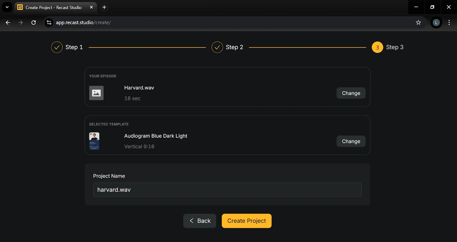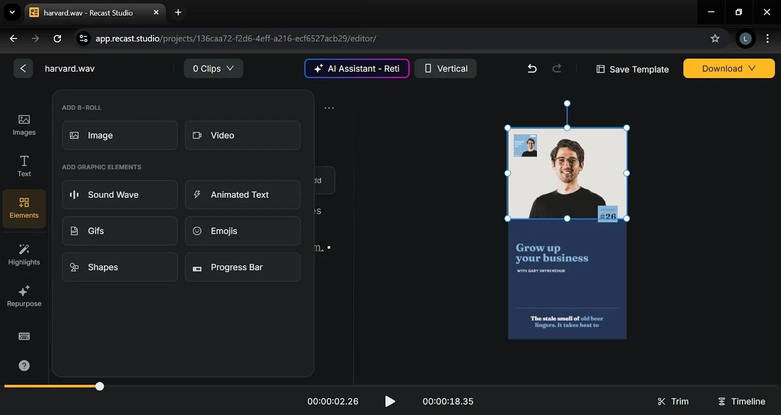 Click the “Create Project” button, and Recast Studio will generate a video highlighting key moments from your audio. You can customize or edit the transcript using the transcript editor and change or customize the templates to match your brand aesthetics.