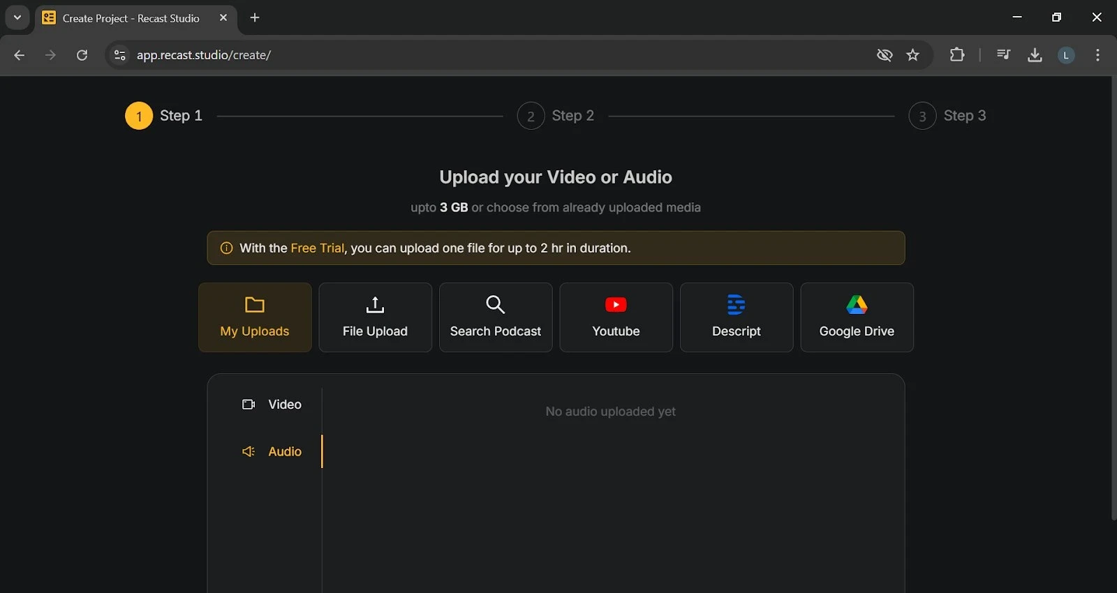 You can upload your podcast audio or video file, which Recast Studio transcribes automatically. You can choose your files from a desktop, Google Drive, or paste directly from YouTube or from any cloud. You can upload an audio or video file up to 3GB in the trial version.