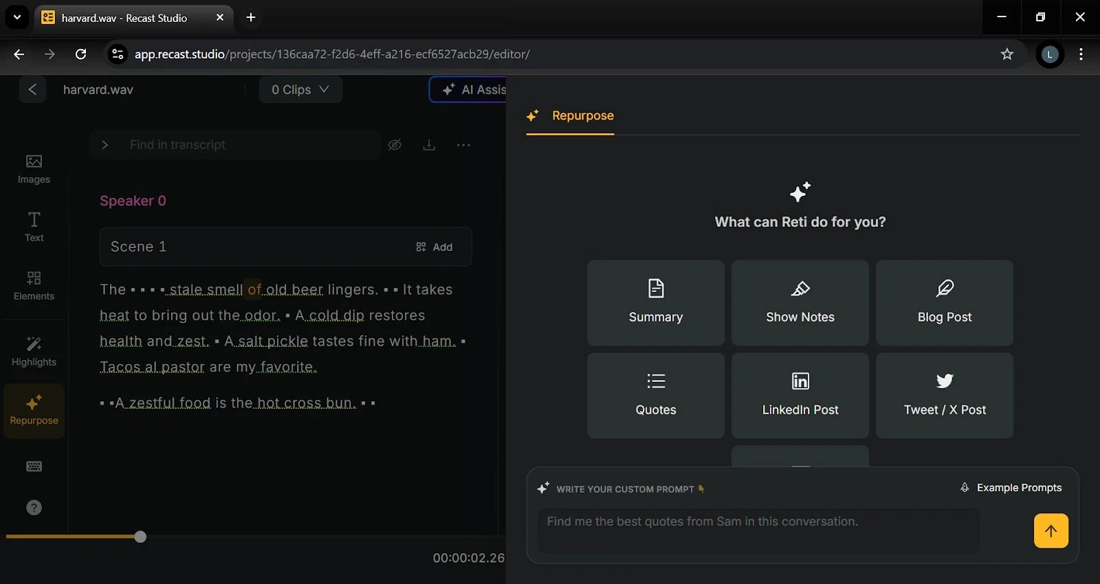 Recast Studio streamlines the entire process of creating social media content from podcast scripts with just a few clicks. Here’s how it works: